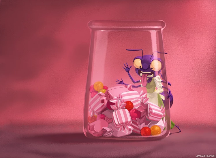 a whimsical scene where an animated ant is peeking out of a jar filled with various candy pieces. The ant appears delighted or curious about the treats inside. The confection pieces include what looks like gummy bears and other