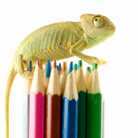 The image features a chameleon sitting atop a stack of colorful pencils. This is an unusual and whimsical scene, as chameleons are not typically associated with pencils or stationery.
