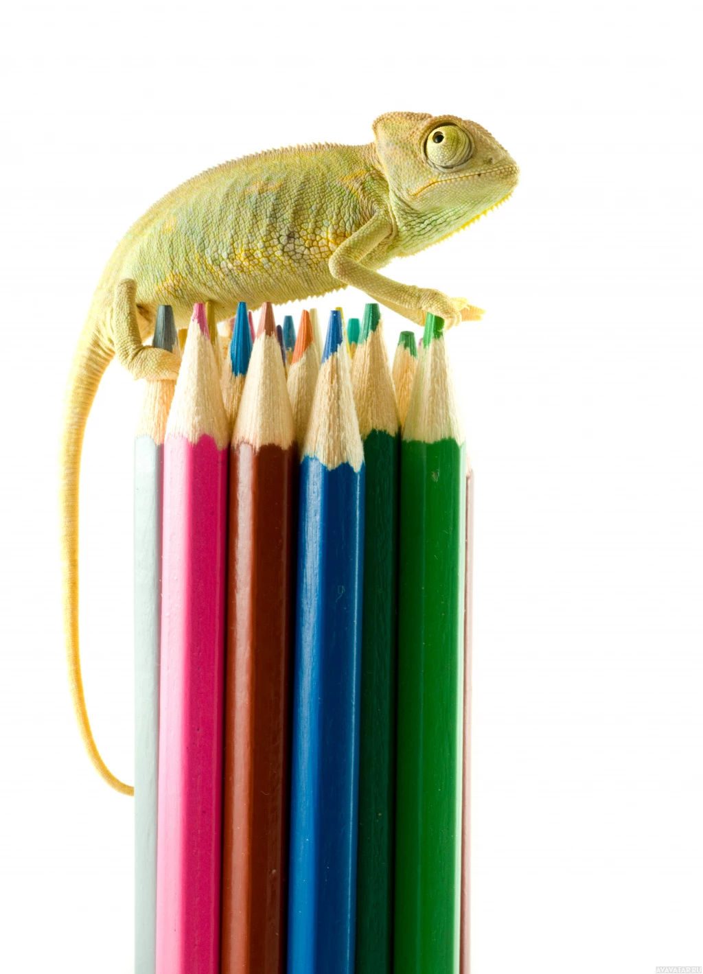 На картинке изображен хамелеон, сидящий на стопке красочных карандашей. Это необычная и причудливая сцена, так как хамелеоны обычно не ассоциируются с карандашами или канцелярскими изделиями.