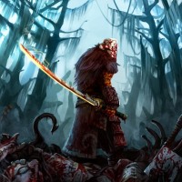 heavy armor, suggesting a role as a warrior or tank in the game. There are also what seem to be severed limbs or