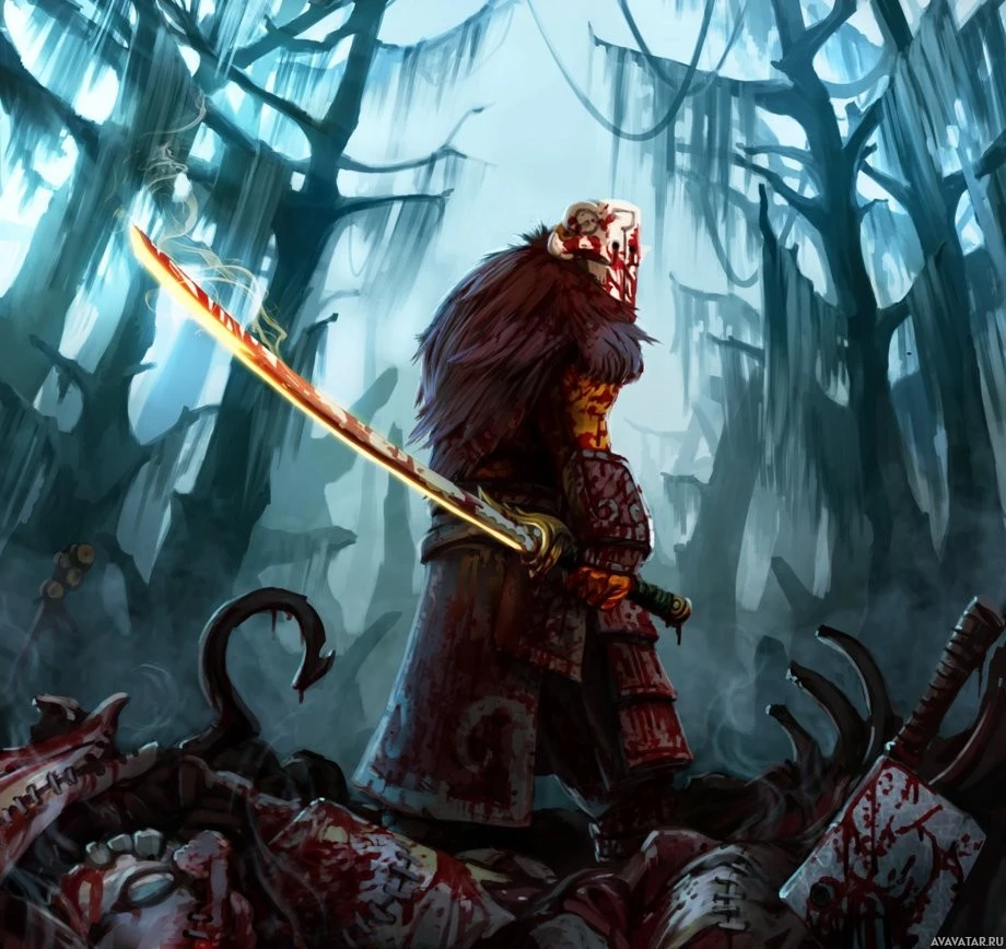 the video game Dota 2. This character is known as Juggernaut, and he is standing in what appears to be a dark,