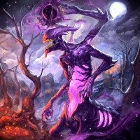 a dark fantasy setting with gothic elements, such as twisted trees and a full moon, adding to the ominous atmosphere of the character.