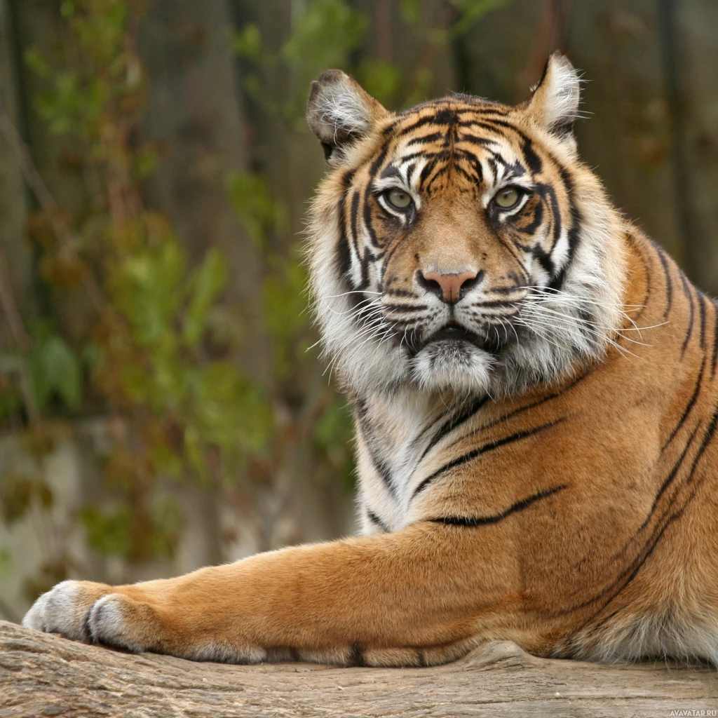 front paws resting on what appears to be a piece of wood or rock. The tiger has a distinctive facial marking typical of the species, which includes