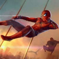 outstretched for balance and precision. There are dynamic elements such as lines suggesting movement or webs, and the background includes cityscape elements, which is typical of Spider-Man's adventures taking place within
