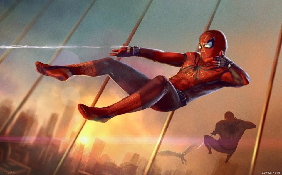 an animated character that appears to be Spider-Man. The character is in mid-air, as if swinging from one web to another with his arms