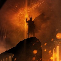a dramatic scene from the Middle-earth universe, where a silhouette of a figure is standing on a rock amidst a fiery landscape. This character resembles Sauron,
