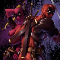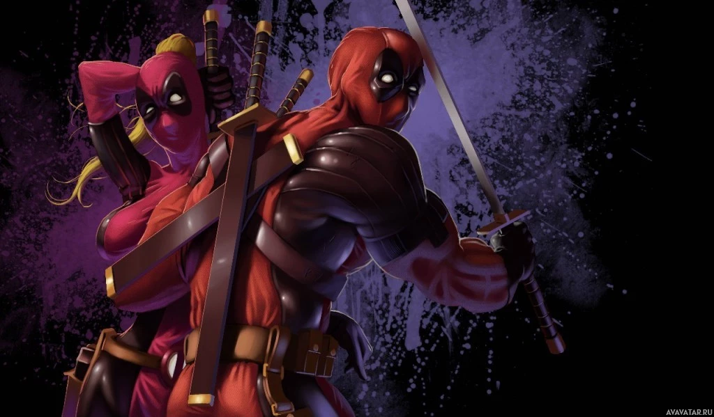 character on the left is wearing black and pink attire, which resembles her comic book costume, and she also has swords crossed behind her back. They are set against