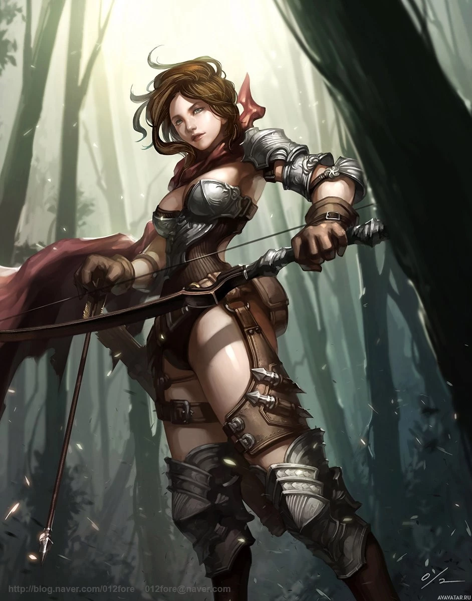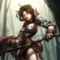 a female character dressed in armor, resembling that of a medieval or fantasy setting. She is holding a bow and arrow, with the quiver on her hip. The setting appears to be a forest, possibly suggesting she might be an archer or part of
