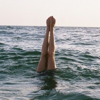a person in the water, likely swimming or floating. Only the legs are visible above