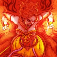 magical abilities. The background is dark with fiery patterns, reinforcing the theme of fire and power associated with her character in the game.