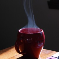 The picture shows a cup of coffee with steam rising from it. The cup is placed on what appears to be a table or countertop, and there's a window with blinds partially drawn in the background. The overall setting suggests an indoor environment during daylight hours, possibly at home or workplace where someone has recently poured hot liquid into the cup.