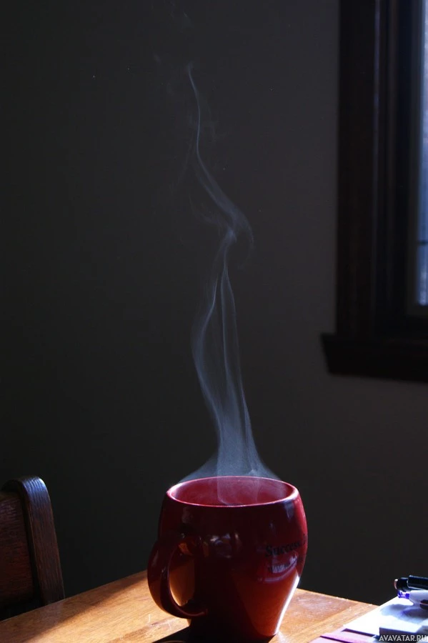 На картине изображена чашка кофе с паром, поднимающимся из нее. Чашка помещается на стол или столешницу, а на заднем плане есть окно с частично нарисованными жалюзи. Общая обстановка предполагает внутреннюю среду в светлое время суток, возможно, дома или на рабочем месте, где кто-то недавно налил горячую жидкость в чашку.