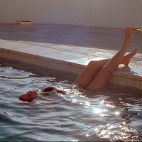 The image shows a person floating in a swimming pool. It appears to be either sunrise or sunset given the soft lighting and the reflection of the sun on the water's surface. The individual is resting with their legs extended, possibly enjoying the tranquility of the pool. The surrounding environment suggests this could be at a beachside resort or similar location.