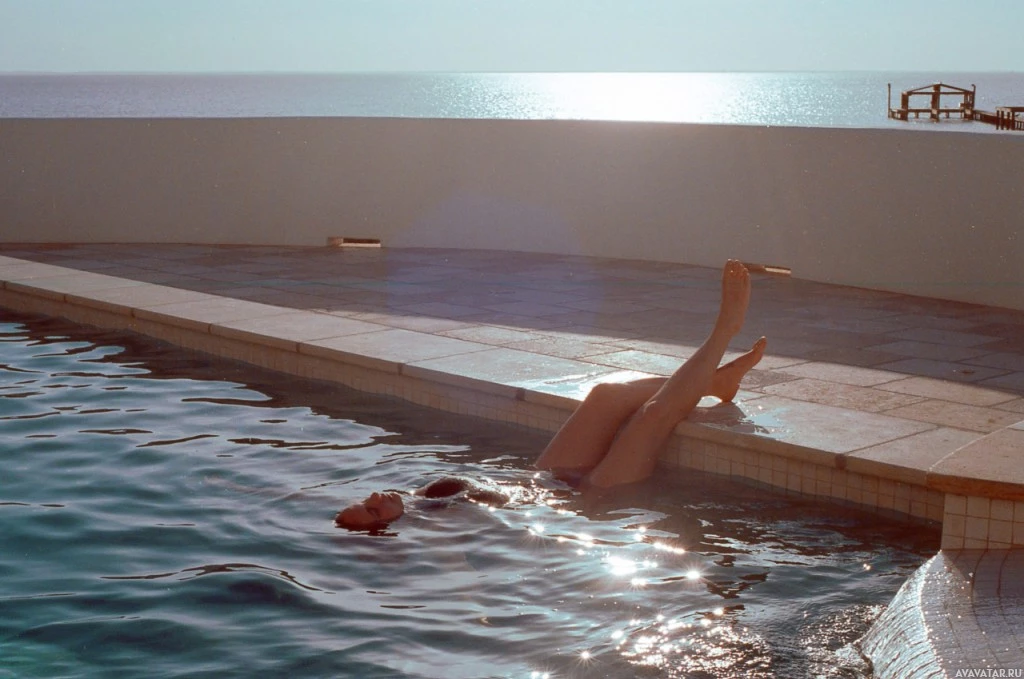 На картинке изображен человек, плавающий в бассейне. Похоже, что это либо восход солнца, либо закат, учитывая мягкое освещение и отражение солнца на поверхности воды. Человек отдыхает с вытянутыми ногами, возможно, наслаждаясь спокойствием бассейна. Окружающая среда предполагает, что это может быть пляжный курорт или аналогичное место.