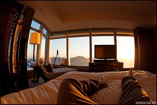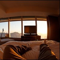 view of the city and mountains beyond, suggesting that it could be taken at either sunrise or sunset. The individual appears relaxed with their feet up, looking towards the window to enjoy the view. There is a television on one side of the room, and various