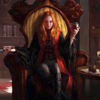 a young woman with red hair seated in a chair that resembles a throne. She is wearing a long, ornate cloak and holding