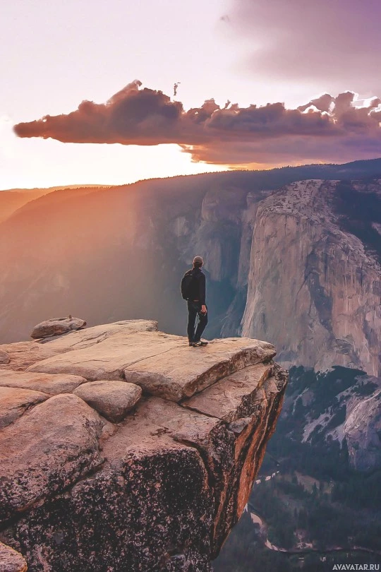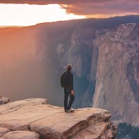 a rocky cliff or ledge at what appears to be sunset. The individual is facing away from the viewer, looking out over the landscape below. The sky has clouds that suggest it might be