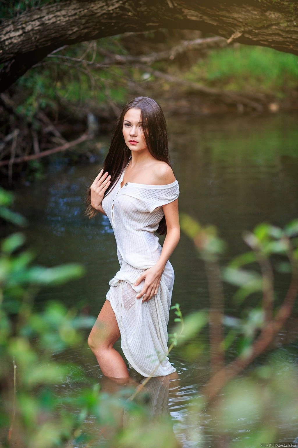 a young woman standing in shallow water along the edge of a body of water, possibly a river or a creek. She has long