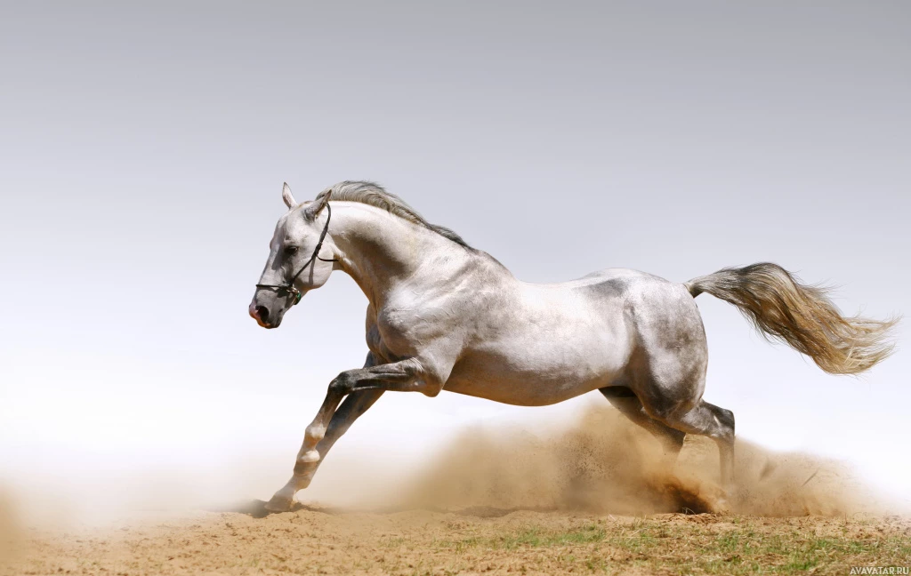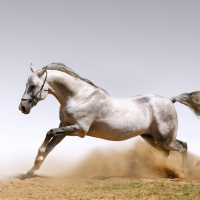 full gallop, kicking up dust from the ground as it runs. It appears to be