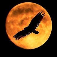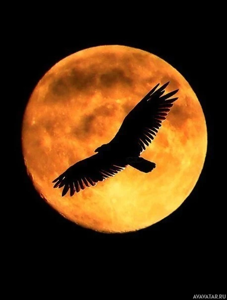 the dark silhouette of the bird and the luminous yellow hue of the moon.