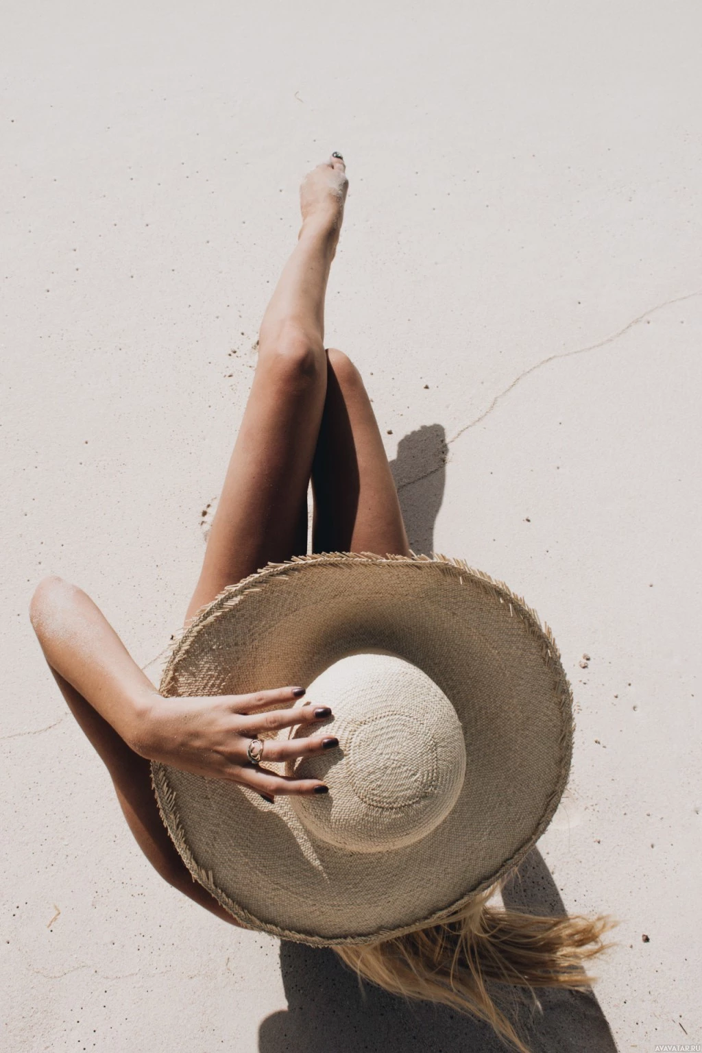 The picture shows a person lying on the sand, wearing a wide-