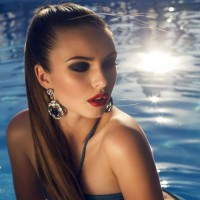 a pool of water. She is wearing makeup and accessories, including large earrings and has her hair styled in