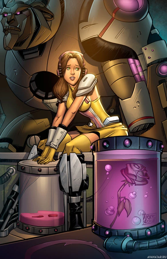 The image depicts an illustration of a girl in a yellow and black suit sitting on what appears to be a robot's shoulders. She has headphones around her neck, suggesting she might be listening to music or communicating with someone. In front of the girl is