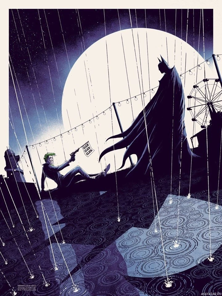 a full moon. Two silhouettes are featured prominently in the picture. One appears to be Batman, recognizable by his cowl and cape, while the other could be the Joker based on the style of the silhouette. They seem to be involved in some
