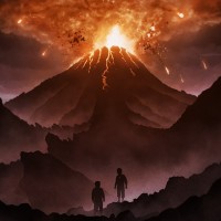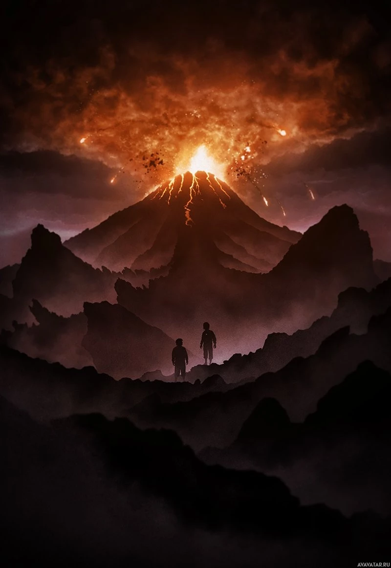 a volcanic landscape, reminiscent of Middle-earth. One character appears to be walking away from the other towards a volcano that is erupting. In the background, there are mountains and a sky with dark clouds, contributing to