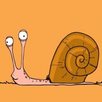 The image shows a cartoon snail. It is characterized by its large eyes, antennae, and a small shell on its back. The snail appears to be smiling or expressing happiness as it crawls across an orange background with green grass at the bottom.