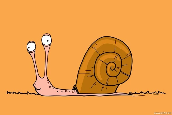 На снимке изображена мультяшная улитка. Для него характерны большие глаза, усики и небольшая оболочка на спине. Улитка улыбается или выражает счастье, когда ползает по оранжевому фону с зеленой травой внизу.