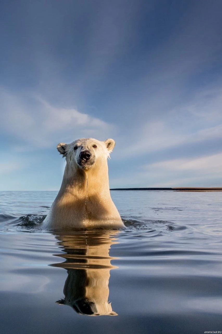 На снимке изображен белый медведь, частично погруженный в воду. Медведь, кажется, смотрит прямо в камеру, захватывая момент любопытства или, возможно, даже игривого поведения. Важно отметить, что белые медведи являются морскими млекопитающими и могут плавать на большие расстояния в поисках пищи или при навигации по своей арктической среде обитания.