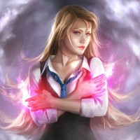 a female character with long blonde hair, wearing what appears to be a school uniform. She has her arms crossed over her chest and is looking slightly away from the viewer. Behind her is a magical or mystical swirl of energy that gives off a pinkish glow, suggesting she might have some sort of