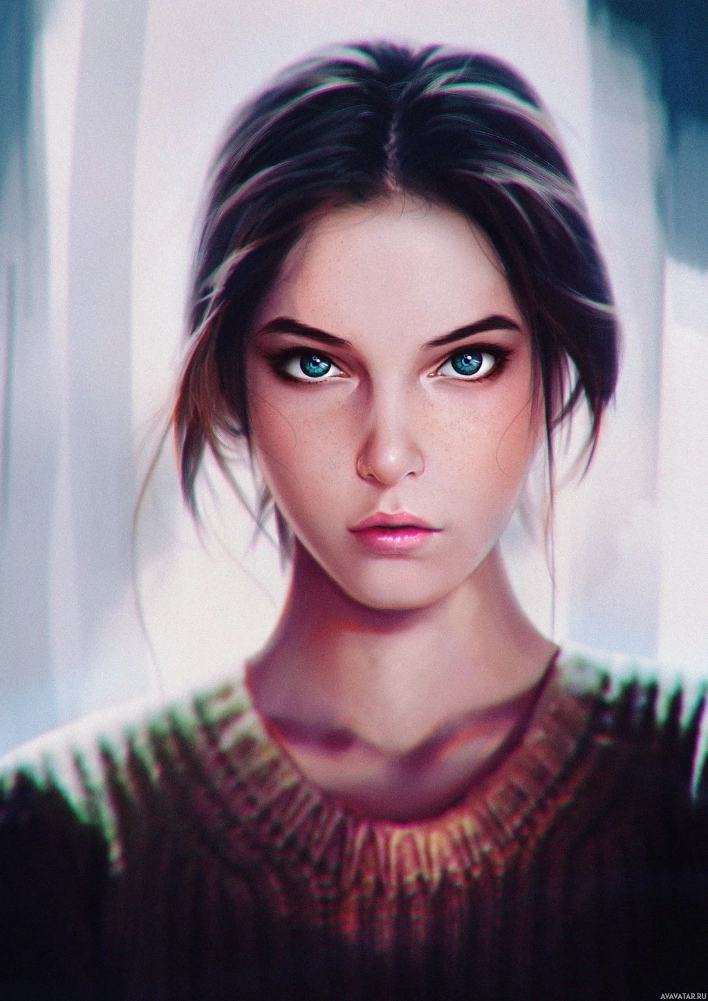 blue eyes, which are typical features for people with European ancestry. The woman is wearing what appears to be