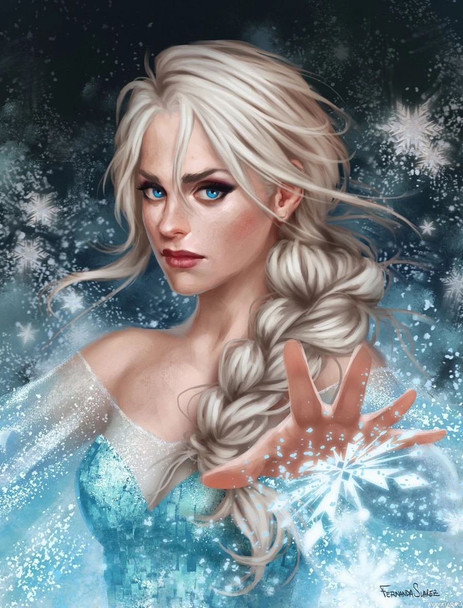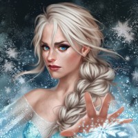 a confident expression and is holding out one hand as if she is controlling or manipulating the surrounding elements, which are depicted as snowflakes and icicles. The style of the image suggests it could be related to