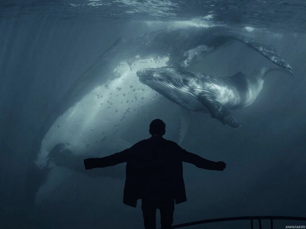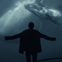 a silhouette of a person standing in water, with their arms outstretched towards the surface. Below the surface, there is a whale, likely
