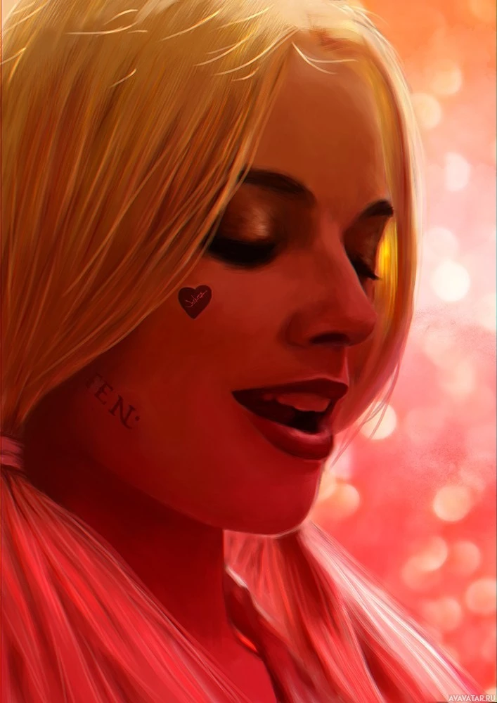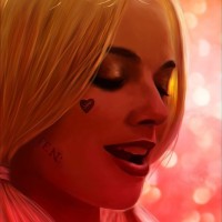 red lipstick and closed eyes, which is characteristic of Harley's look in various media. The background has a warm, pinkish tone with bokeh effects, which gives the image