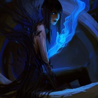 dark hair and a thoughtful expression on her face. Her attire includes what appears to be a cloak or robe with