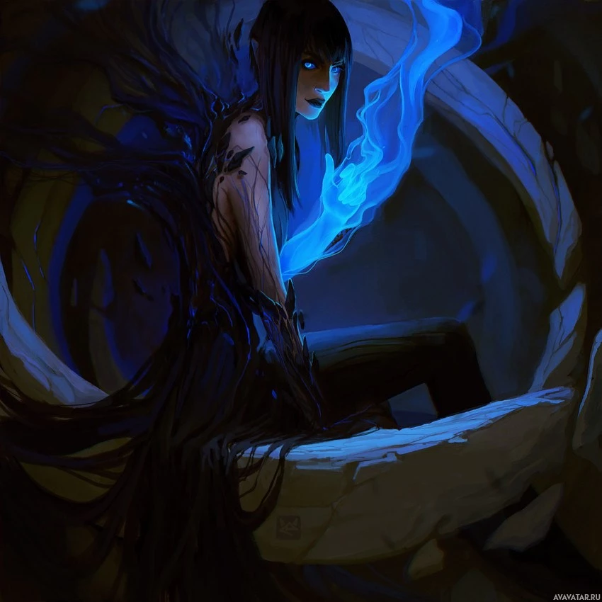 magical abilities. The surrounding environment includes dark rock formations and roots, giving the impression of an underground cave or a mysterious location within