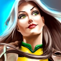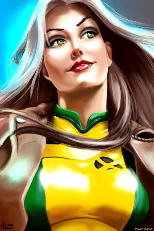 a dynamic pose that suggests movement or action. Her attire includes elements of the X-Men's