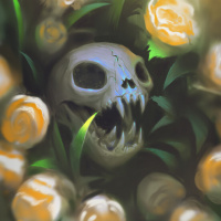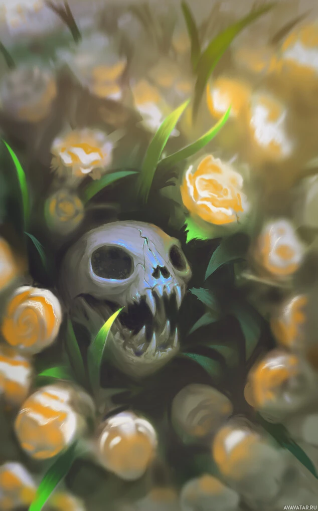 natural light filtering through the foliage, creating a somewhat eerie yet beautiful contrast between the macabre symbol of death and the vibrant life represented by the flowers.