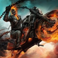 comic book anti-hero known for riding a motorcycle and using his chain to attack. In this particular illustration, the Ghost Rider is shown with flames engulfing his chains and motorcycle, creating an intense and fiery scene. The character's face is not visible in this picture, adding