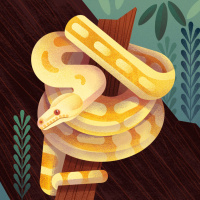 a forest environment, with trees and foliage depicted in the background. The snake is coiled around something that looks like