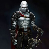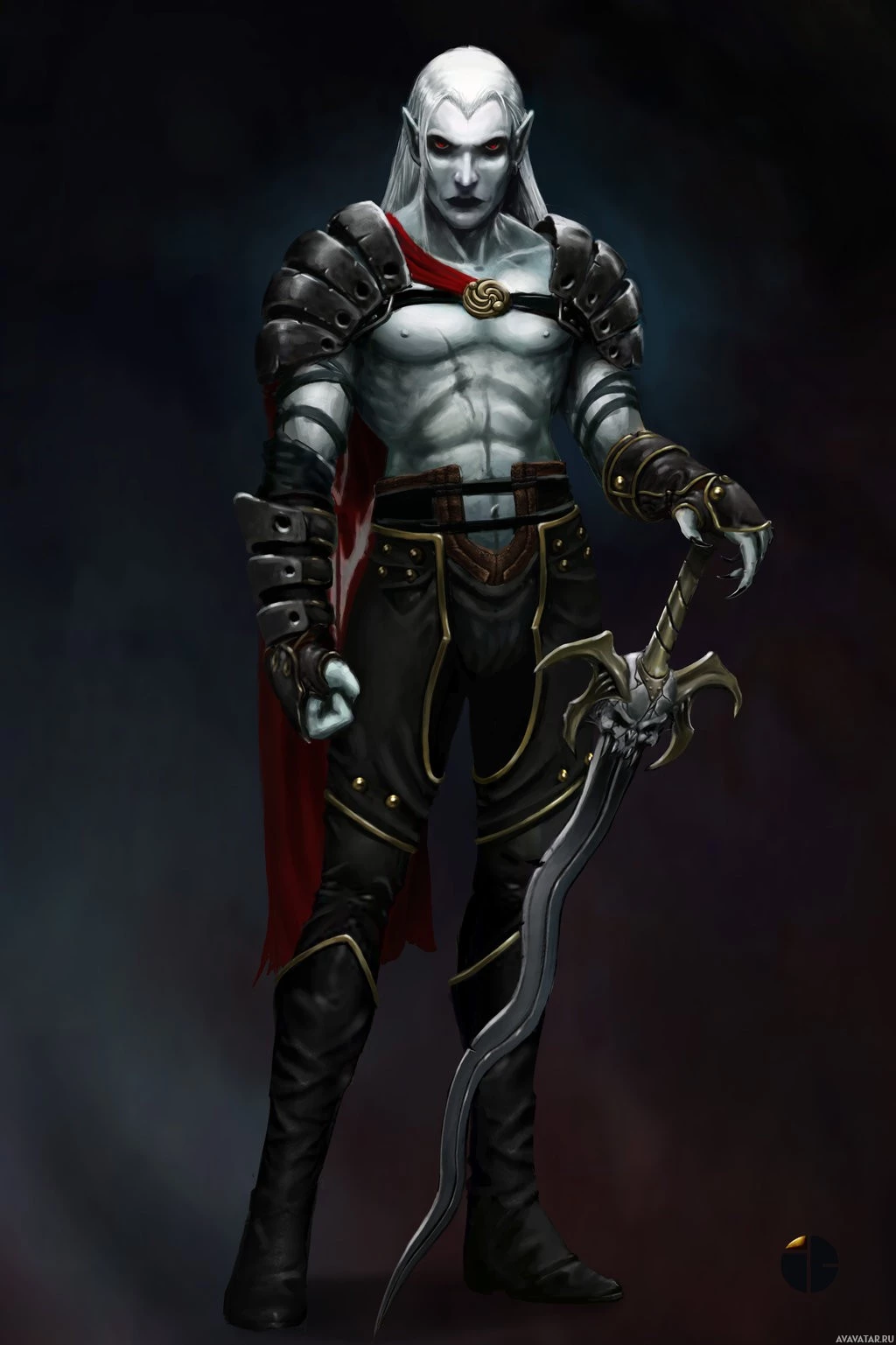 The image shows a character who appears to be a fantasy or vampire-inspired figure, standing against