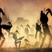 the Star Wars franchise, often referred to as stormtroopers or clones. They are seen in a desert-like environment with a backdrop that might be interpreted as a battlefield due to the presence of what appears to be weaponry and smoke. The lighting is dramatic, creating