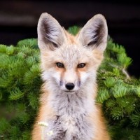 The image shows a red fox sitting upright on its hind legs, looking directly at the camera with an alert expression. It appears to be in a natural environment, possibly a forest or meadow, as suggested by the presence of plants and shrubs in the background.