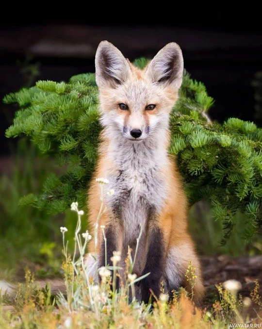 На картинке красная лиса сидит прямо на задних лапах, глядя прямо на камеру с выражением тревоги. Он, по-видимому, находится в естественной среде, возможно, в лесу или на лугу, как предполагает наличие растений и кустарников на заднем плане.