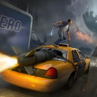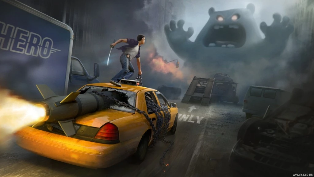 a large figure that resembles a monster or a robot with its arms outstretched towards the player. The setting seems to be a street with destruction around them, indicating conflict or chaos within