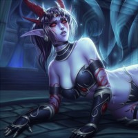dark elves) in role-playing games. The character has pointed ears, horns, and