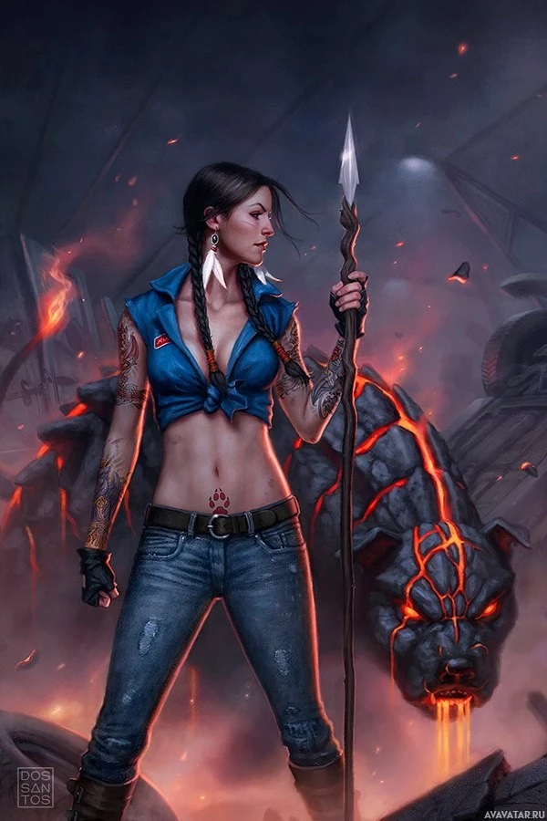 dark hair and is dressed in a blue top with a denim jacket over it, wearing combat boots. The character is holding a spear or lance and seems to be engaged in some
